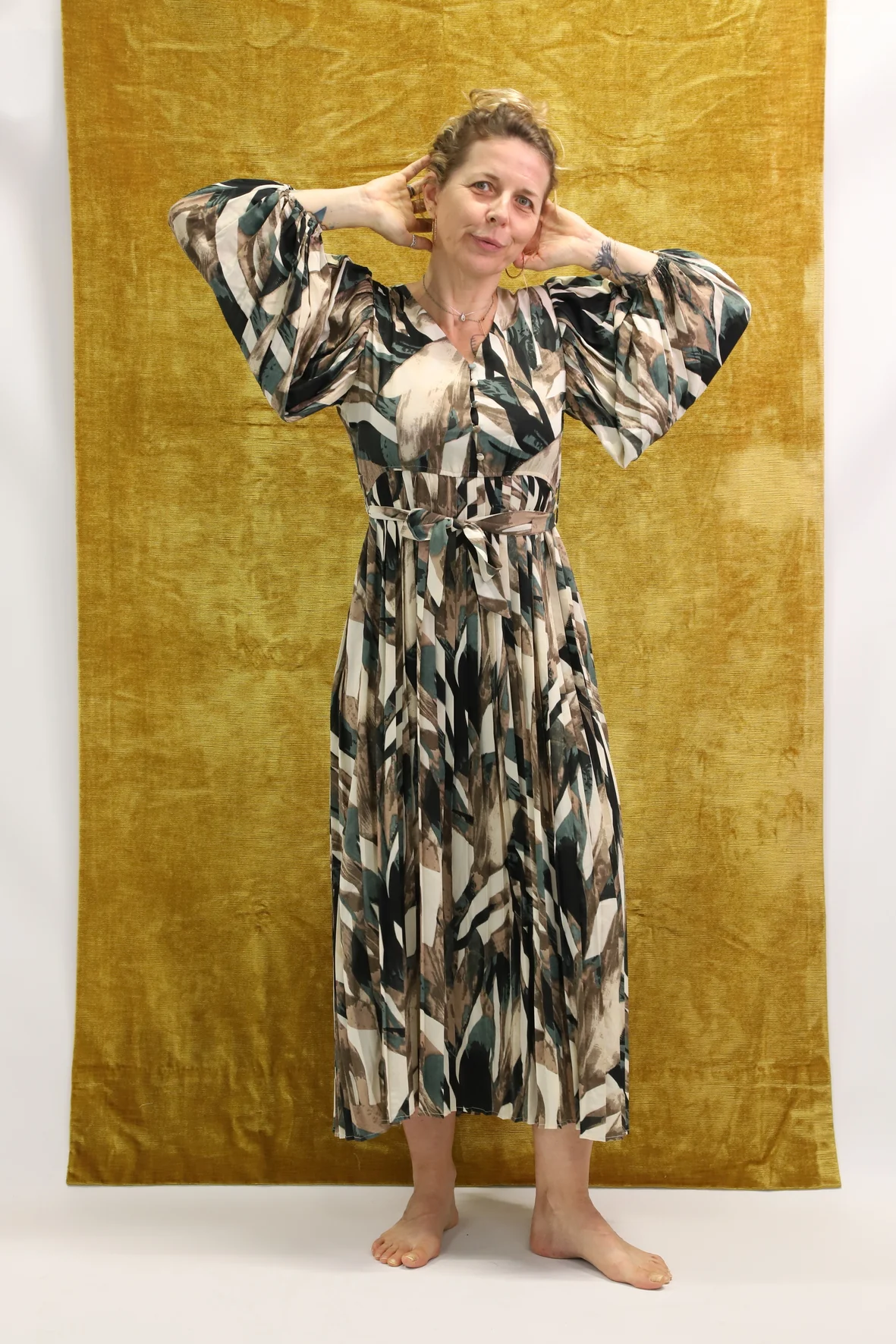 | DESCRIPTIF | Robe longue plissée, manches longues |