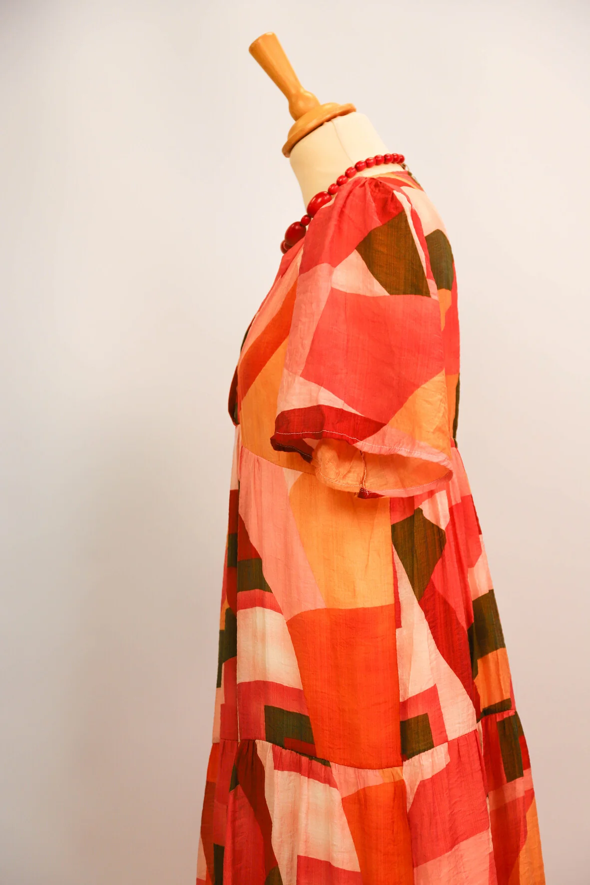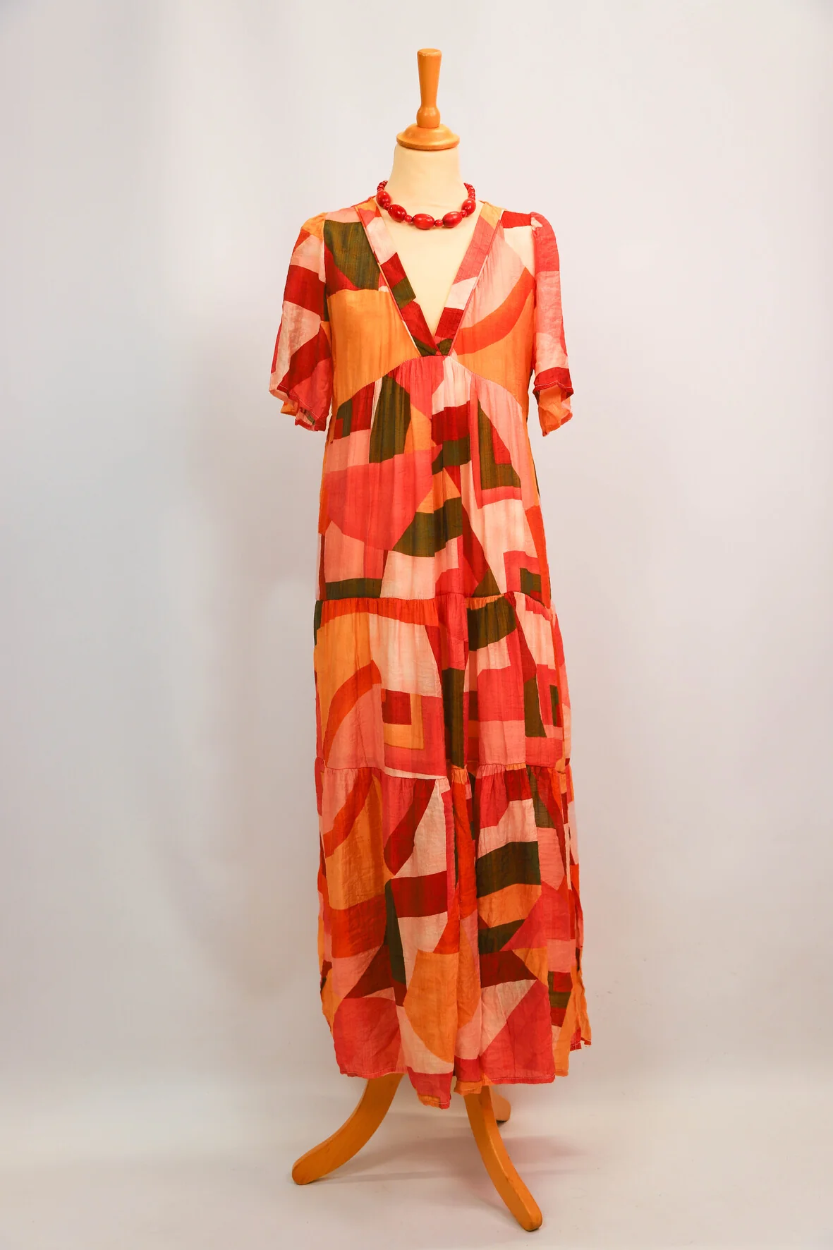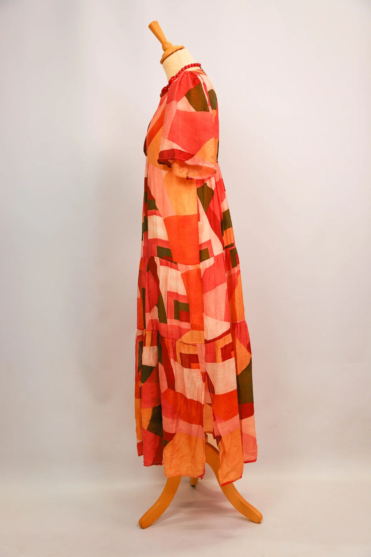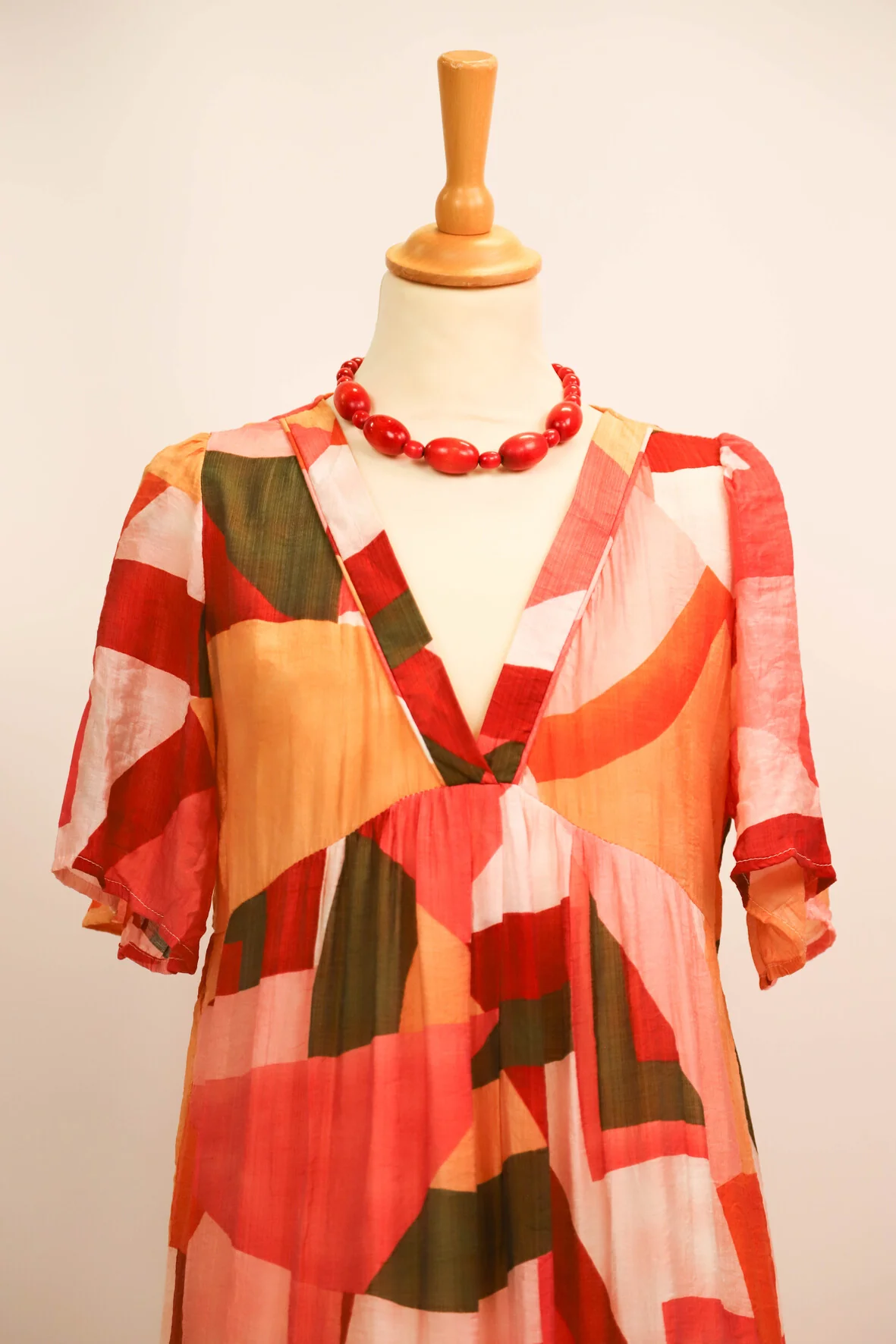 Robe longue et fluide avec doublure, manches courtes. Motifs géométriques en camaïeu de rose
