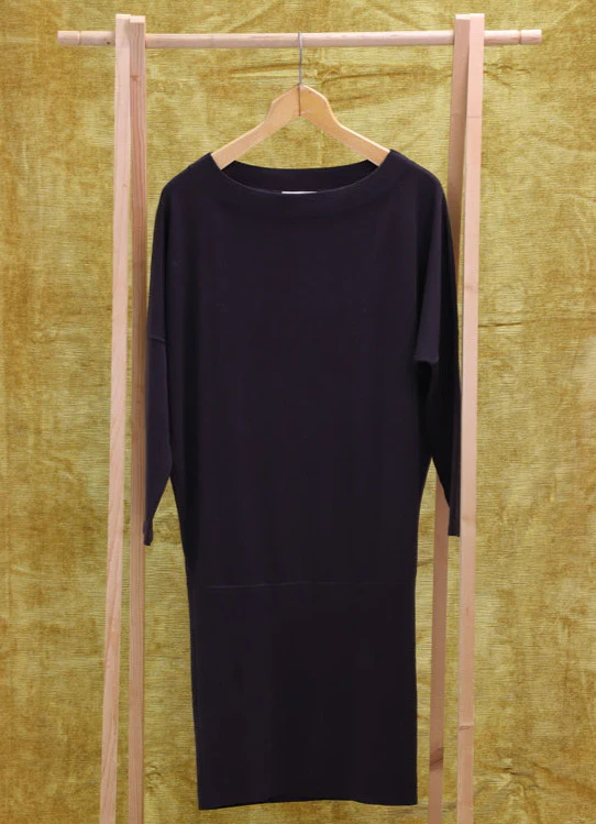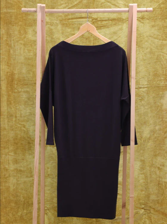 – Robe pull en maille marron chocolat, encolure dégagée, manches longues chauve-souris