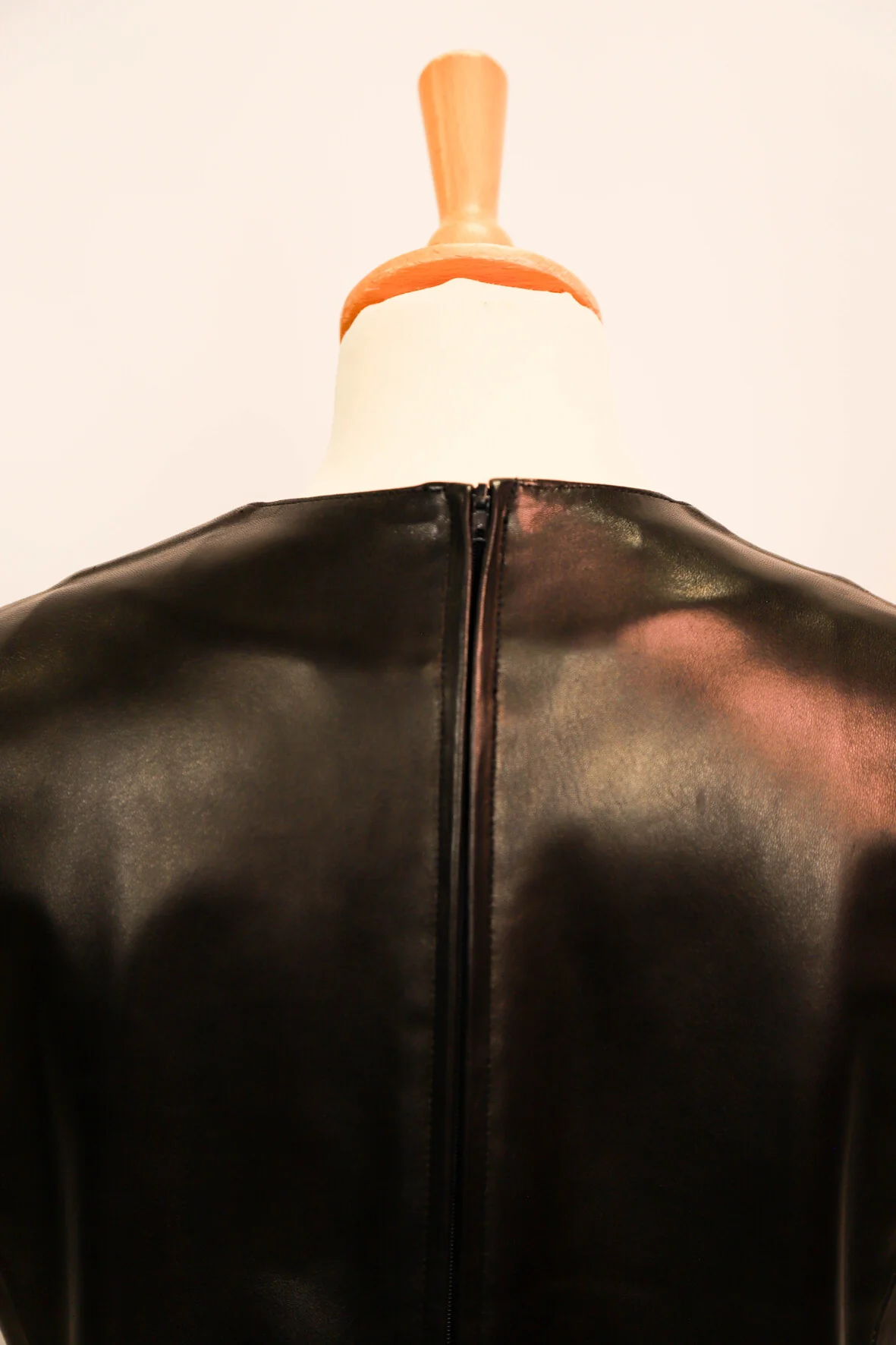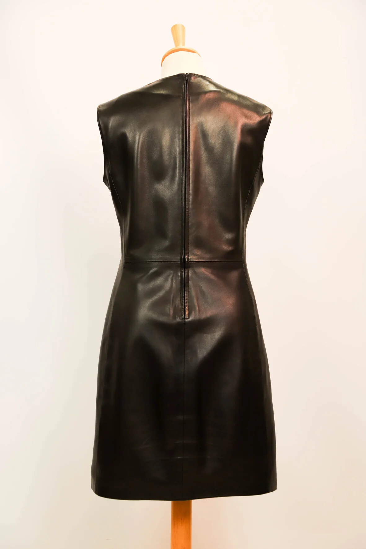 DESCRIPTIF Robe en cuir sans manches, col rond, doublure. Longue fermeture dans le dos