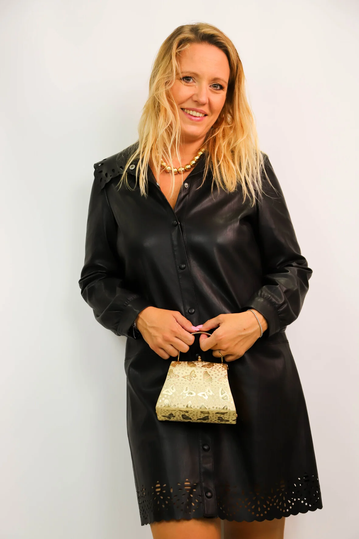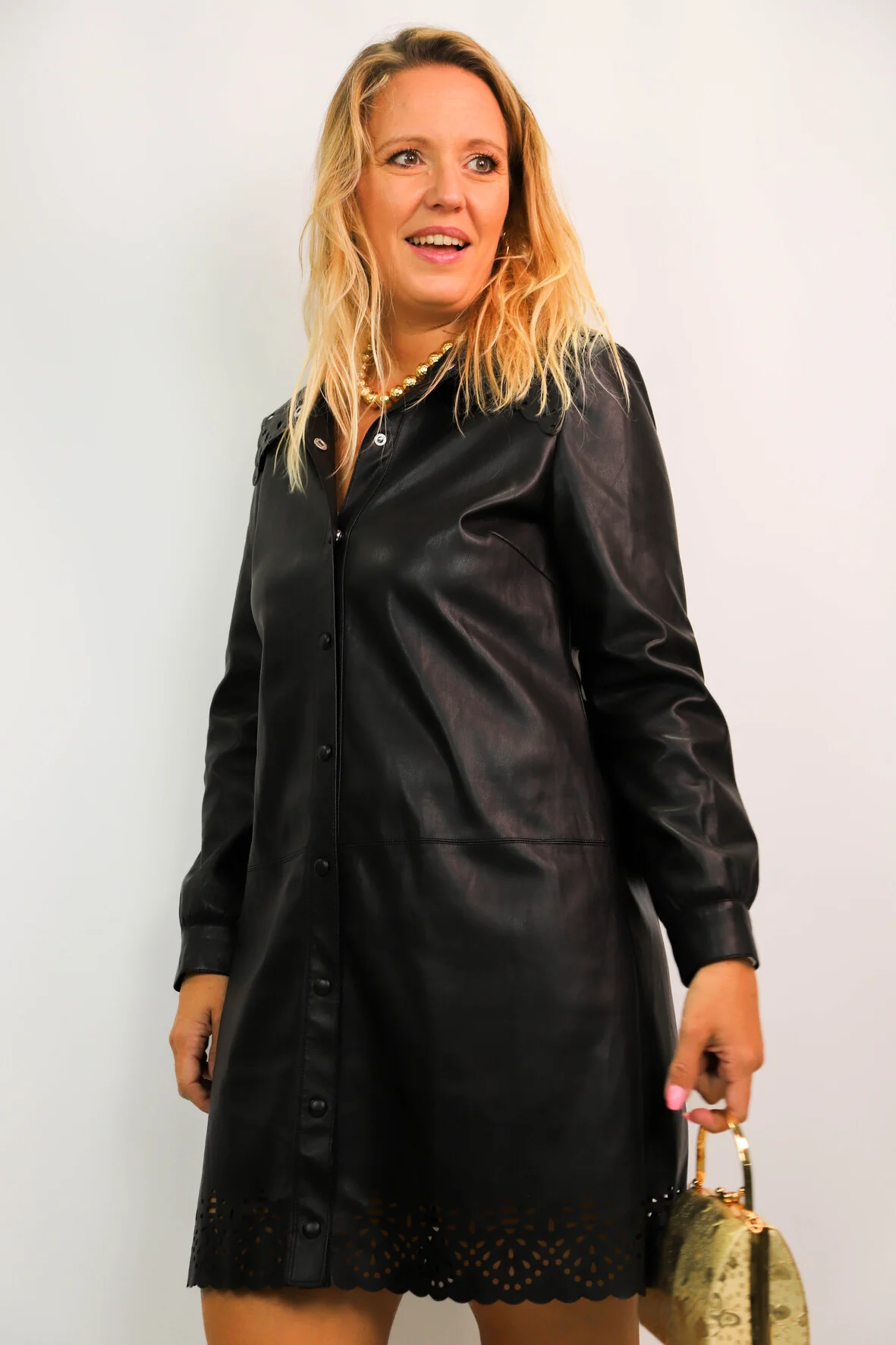 DESCRIPTIF Robe en similicuir à manches longues. Col et bas de la robe ajourée