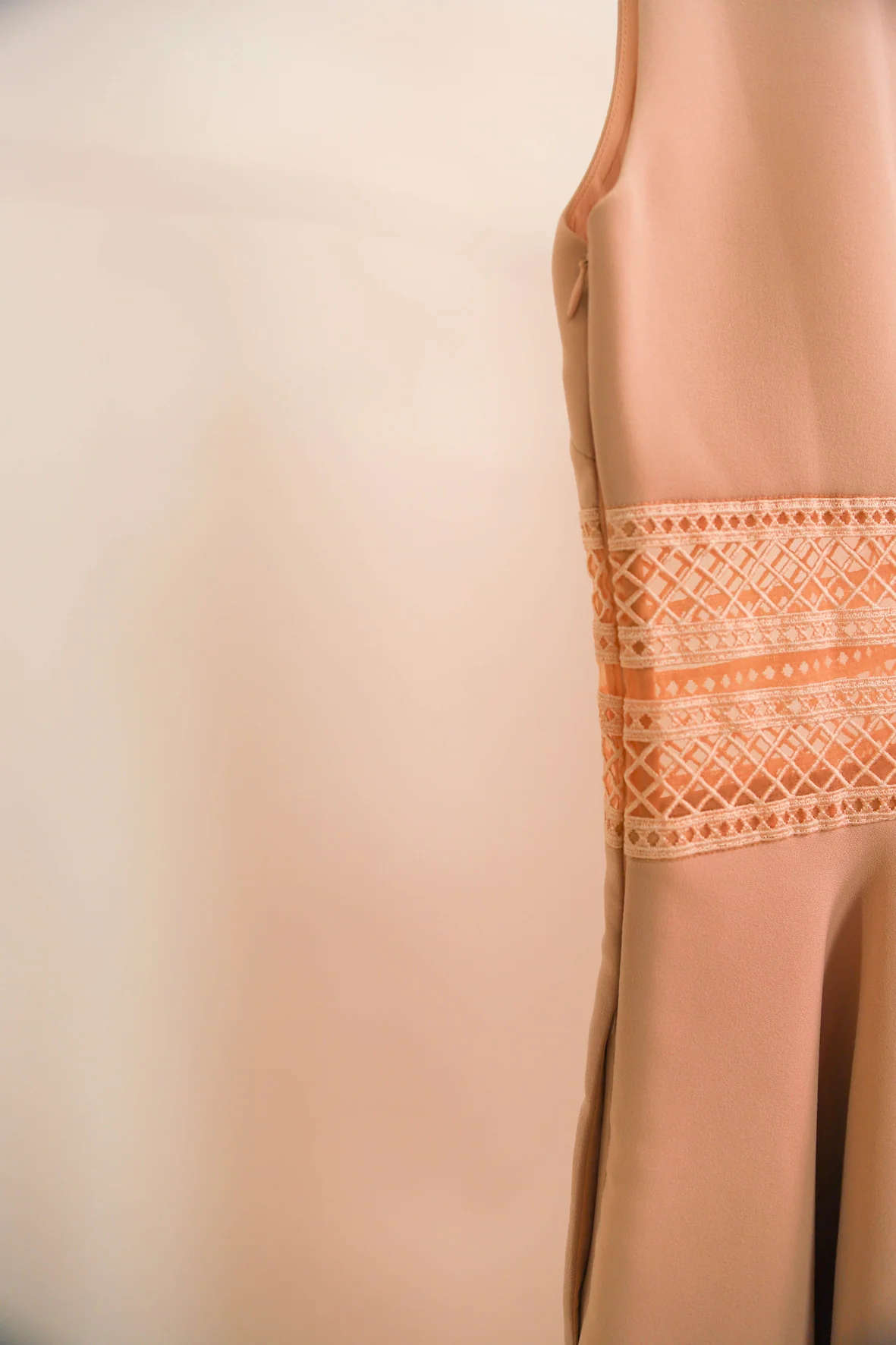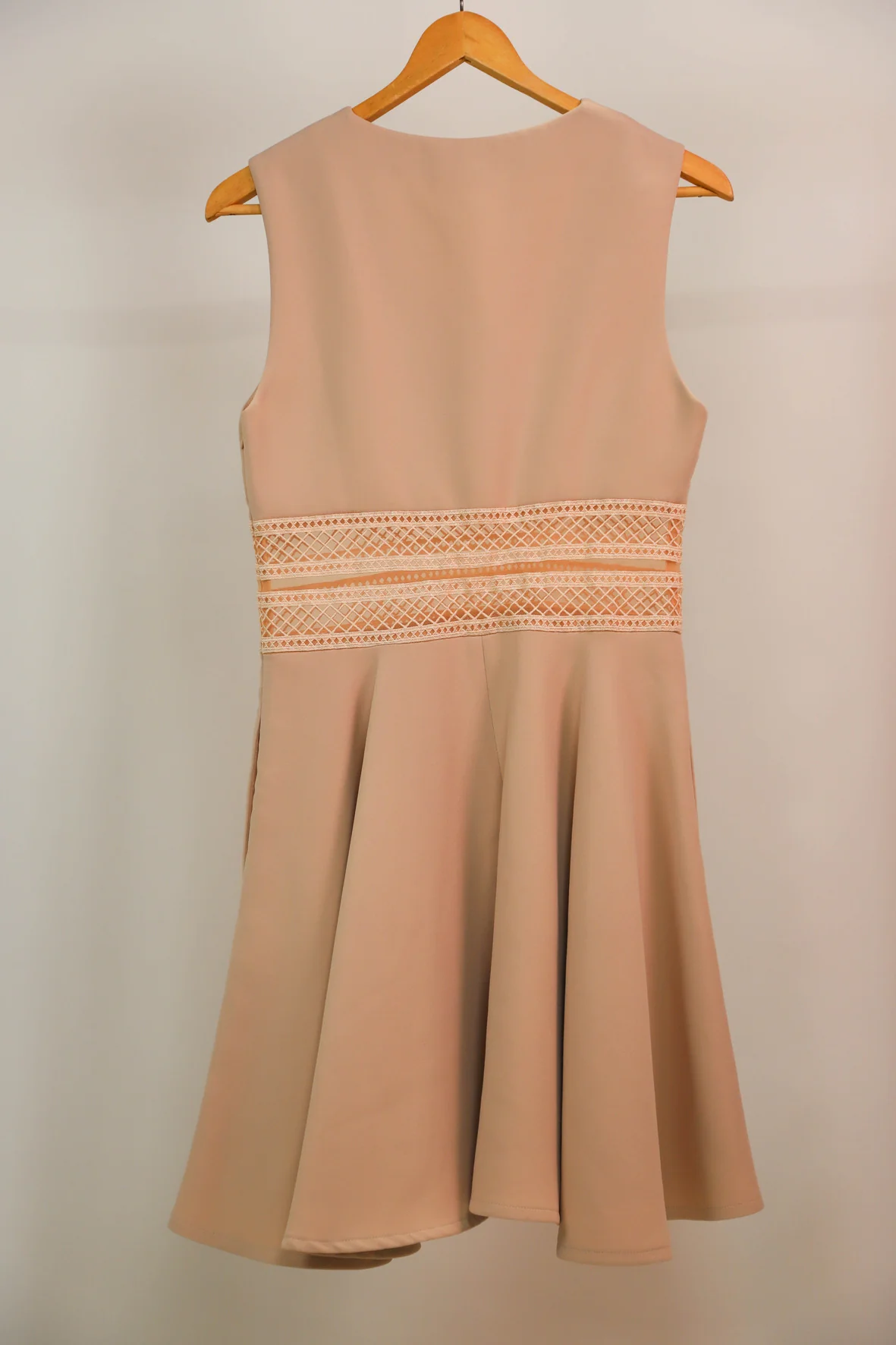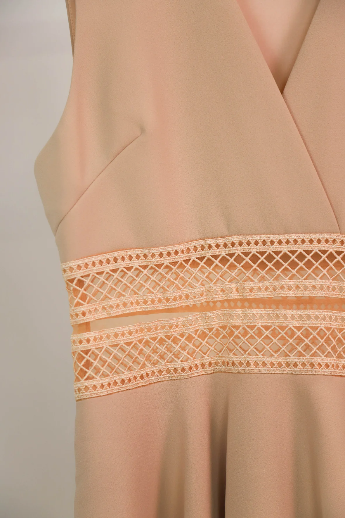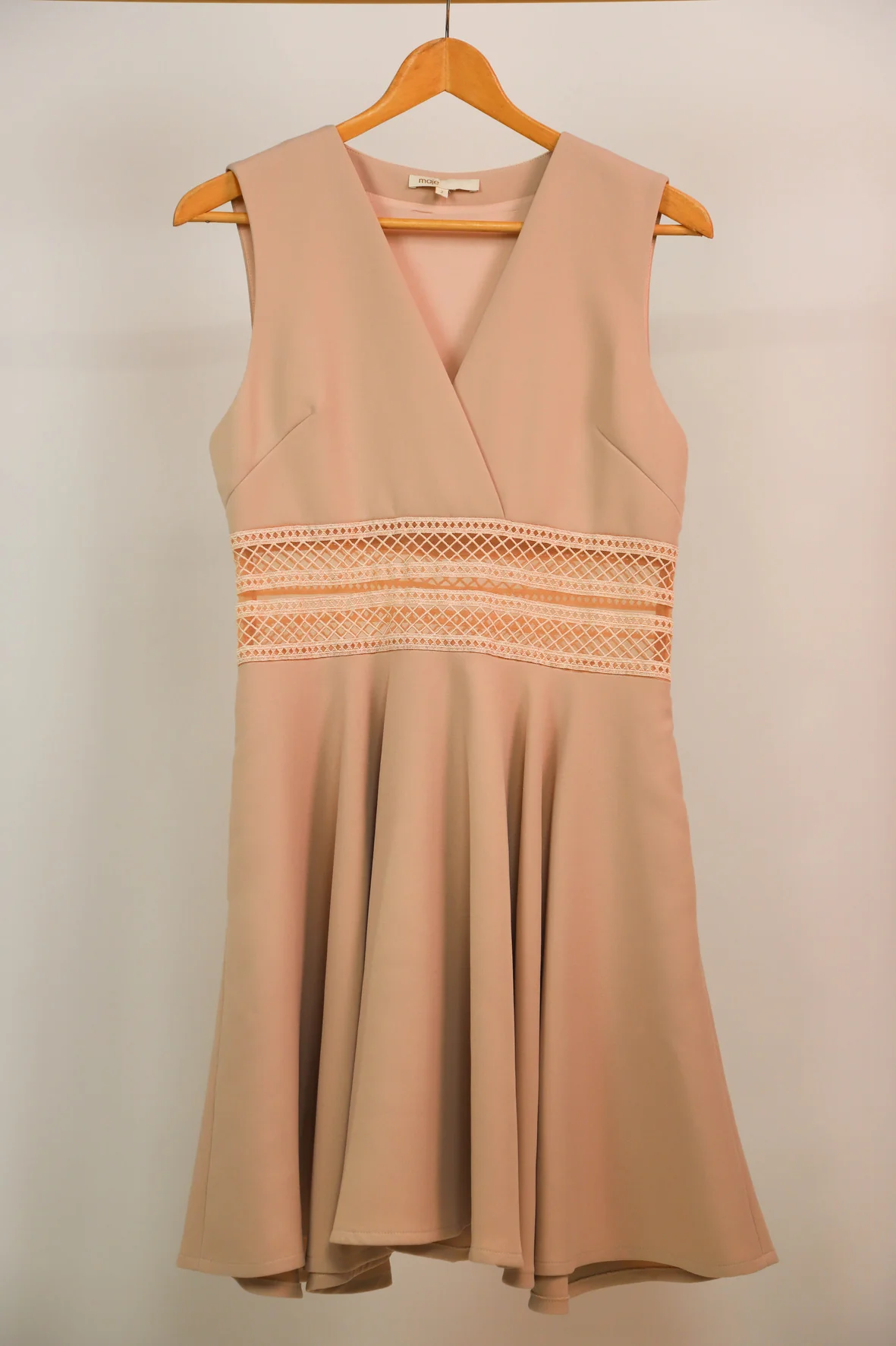 DESCRIPTIF Robe courte doublée. Cintrée et évasée sur le bas. Ajourée à la taille avec tulle et poches