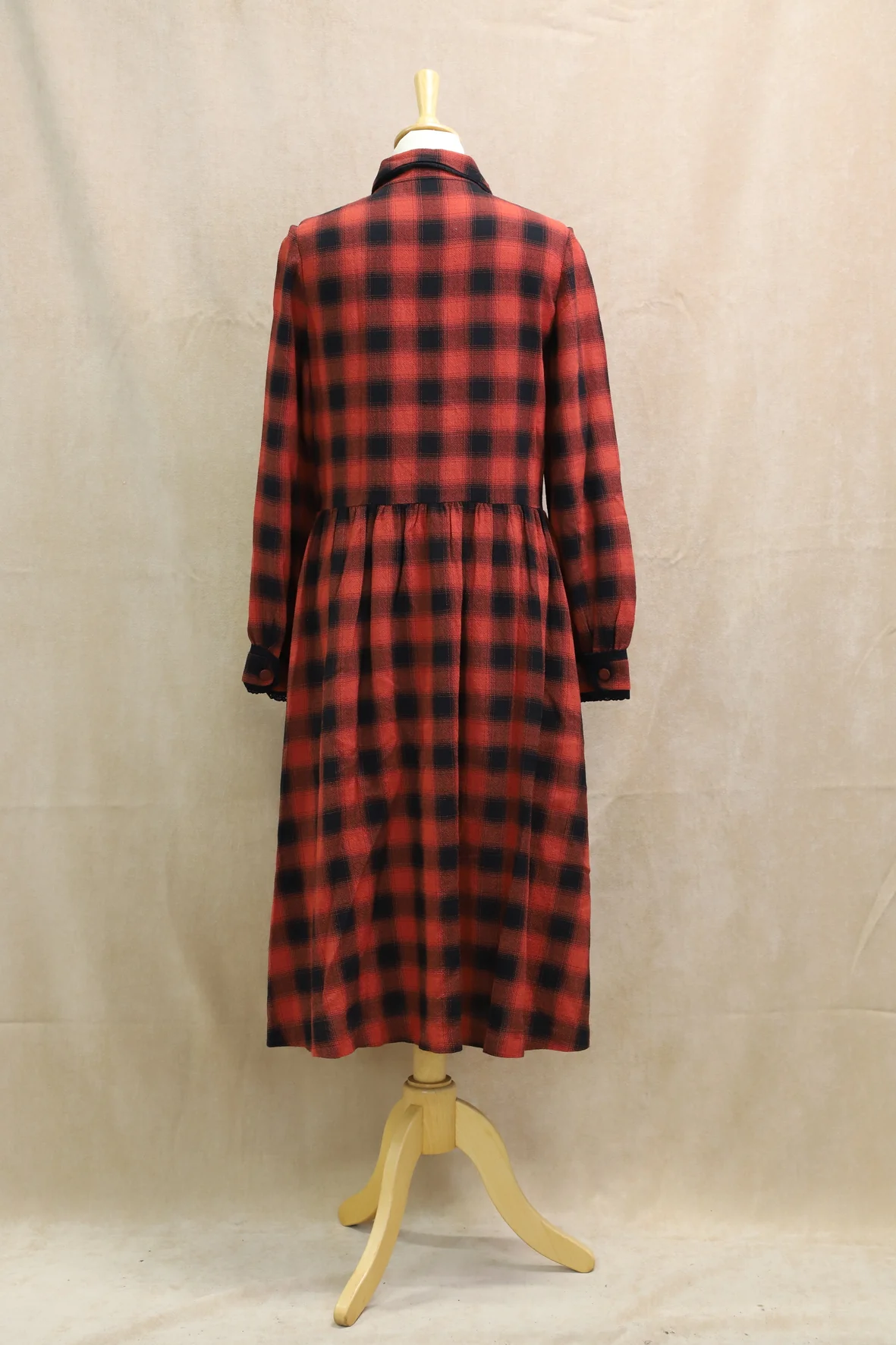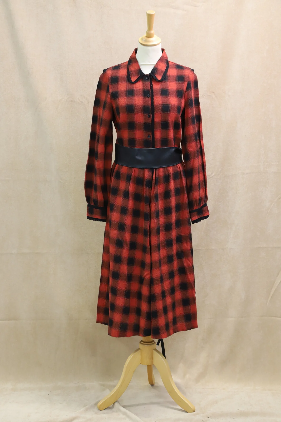 Robe manches longues, rouge foncé et noir.Fines dentelles au col et aux poignets.