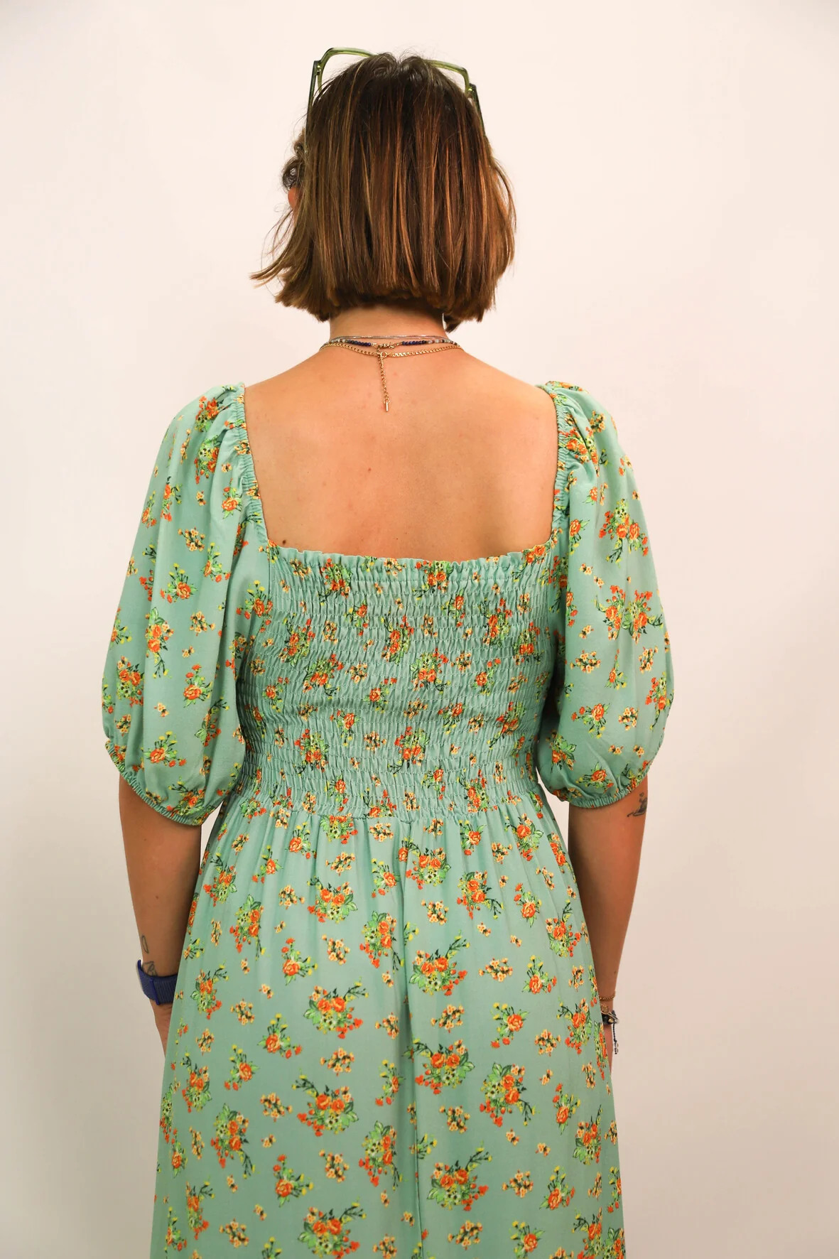 | DESCRIPTIF | Robe longue fleurie. Manches courtes ballons, col carré avec smock à l’arrière |
