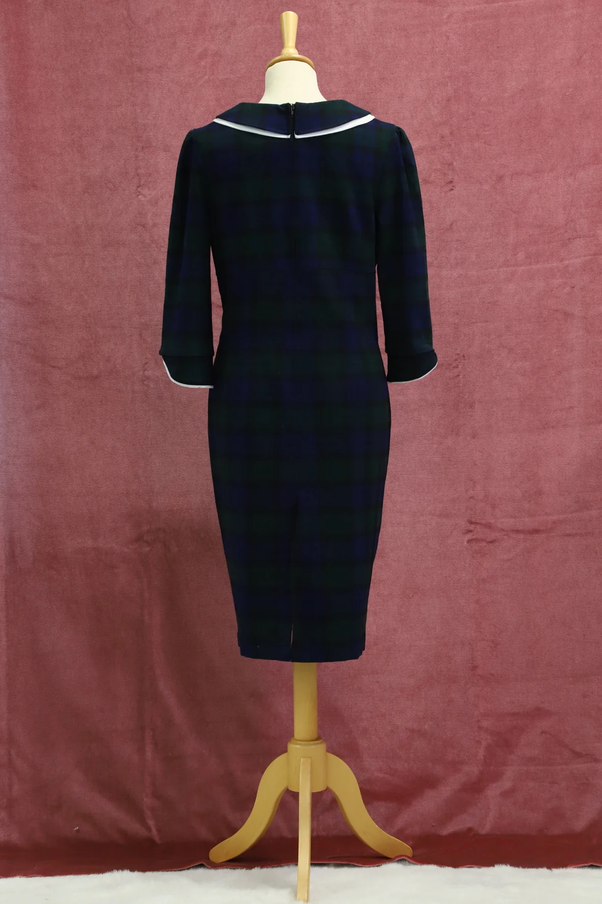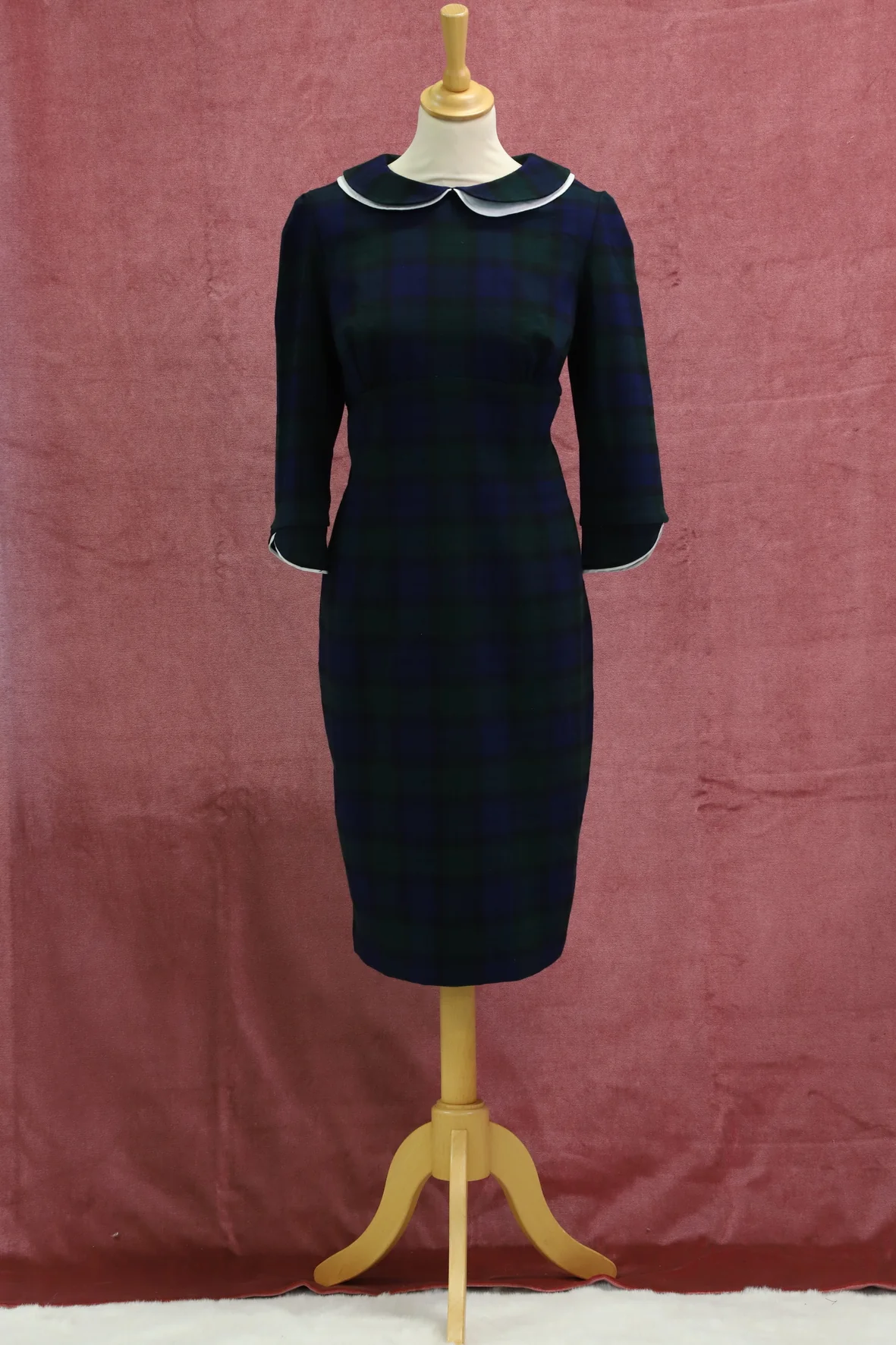 DESCRIPTIF Robe rétro à carreaux, manches 3/4, col claudine double, longueur midi