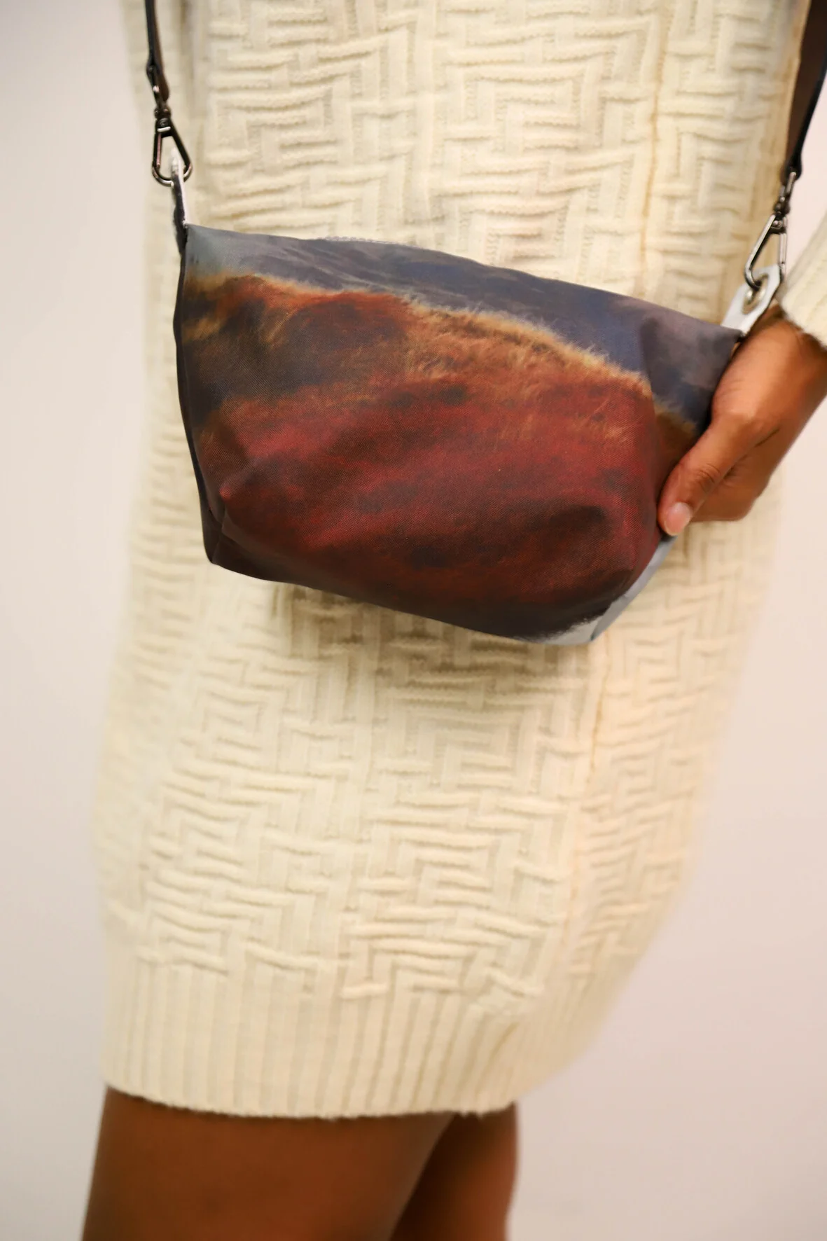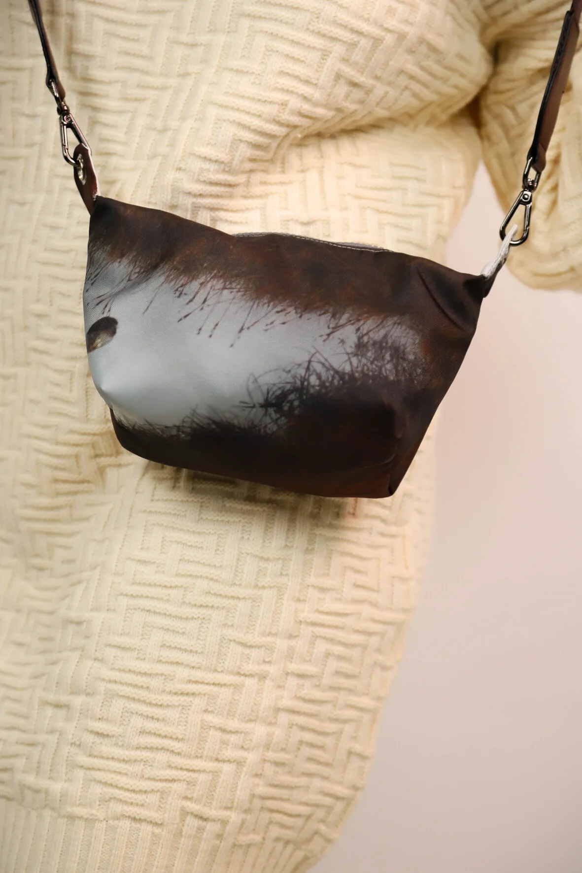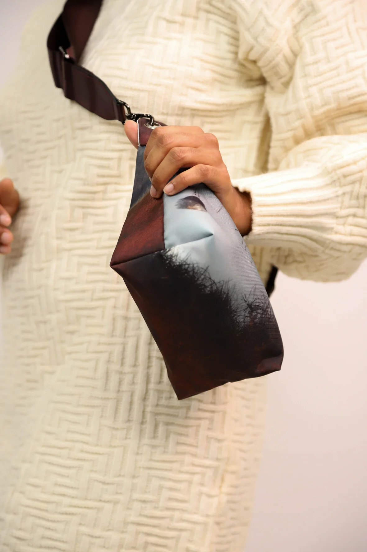 Sac pochette avec sangle de seconde main réglable prune. Fermeture éclaire grise
