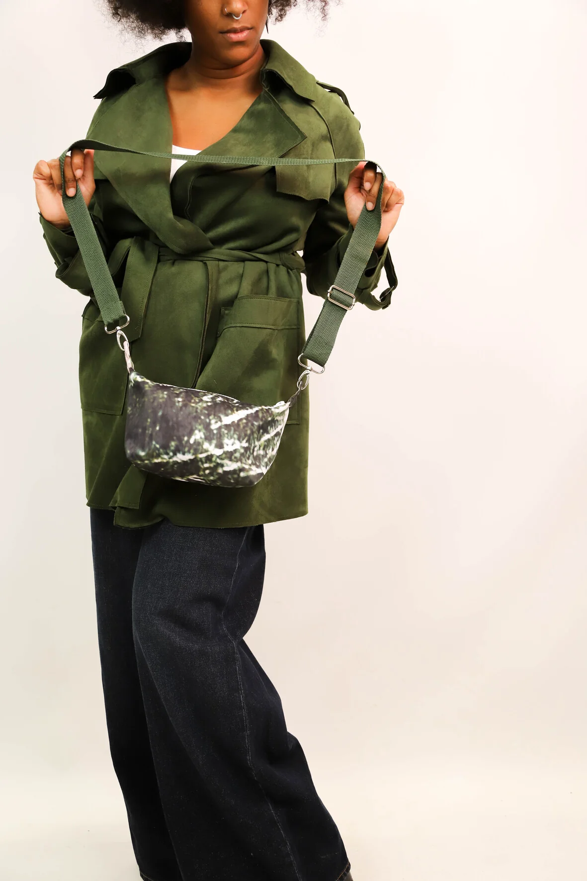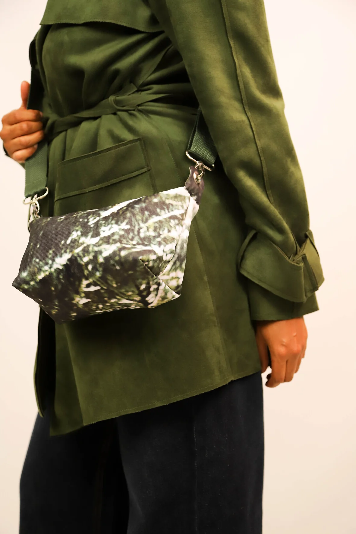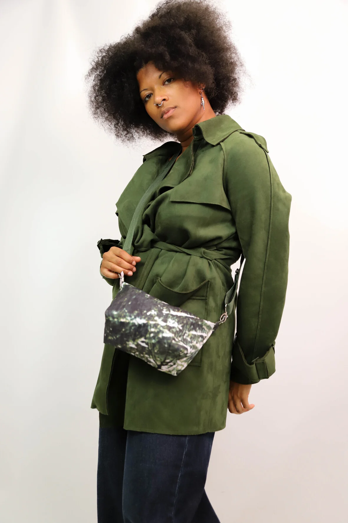 Sac pochette avec sangle de seconde main réglable verte. Fermeture éclaire blanche.