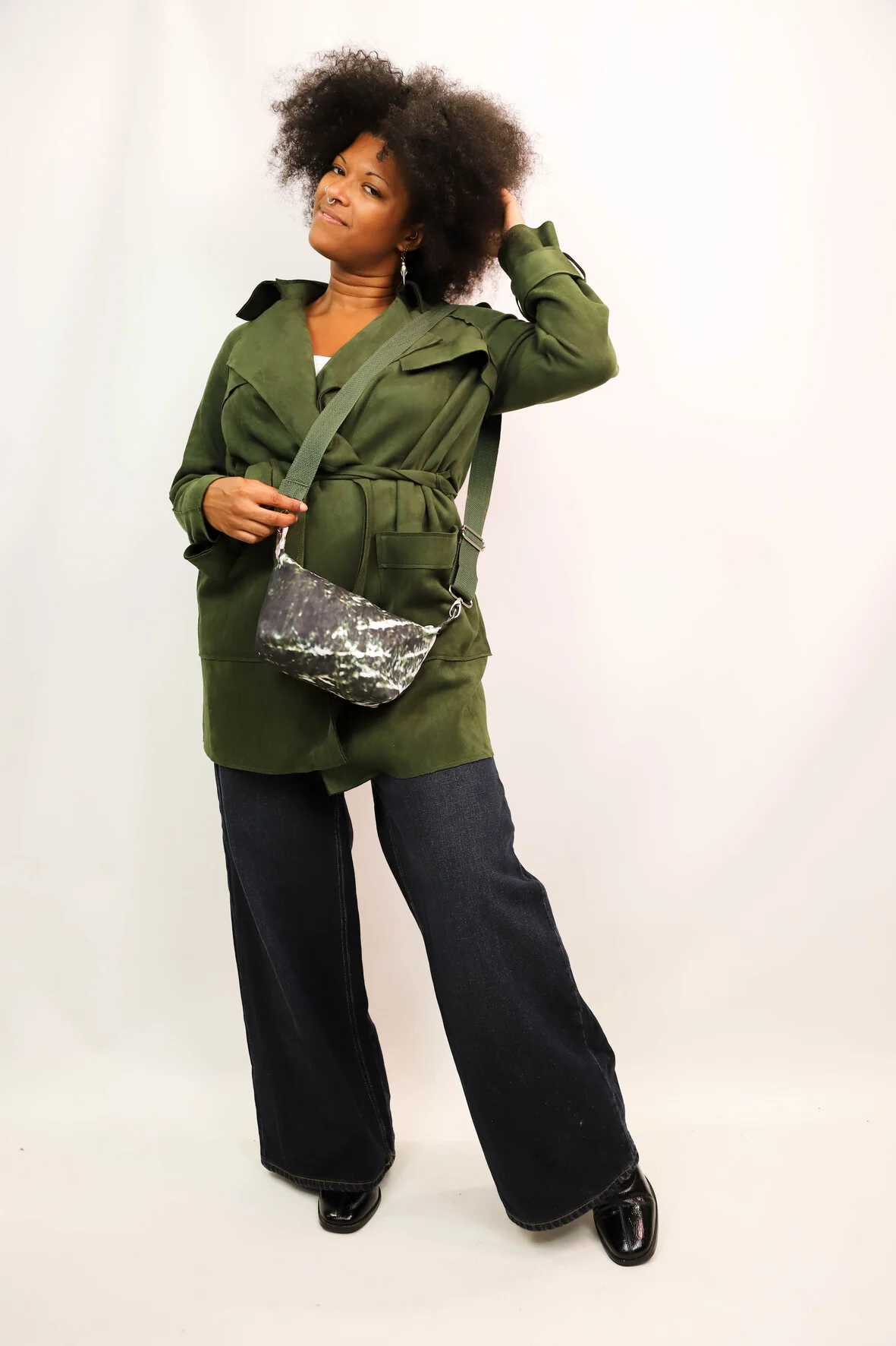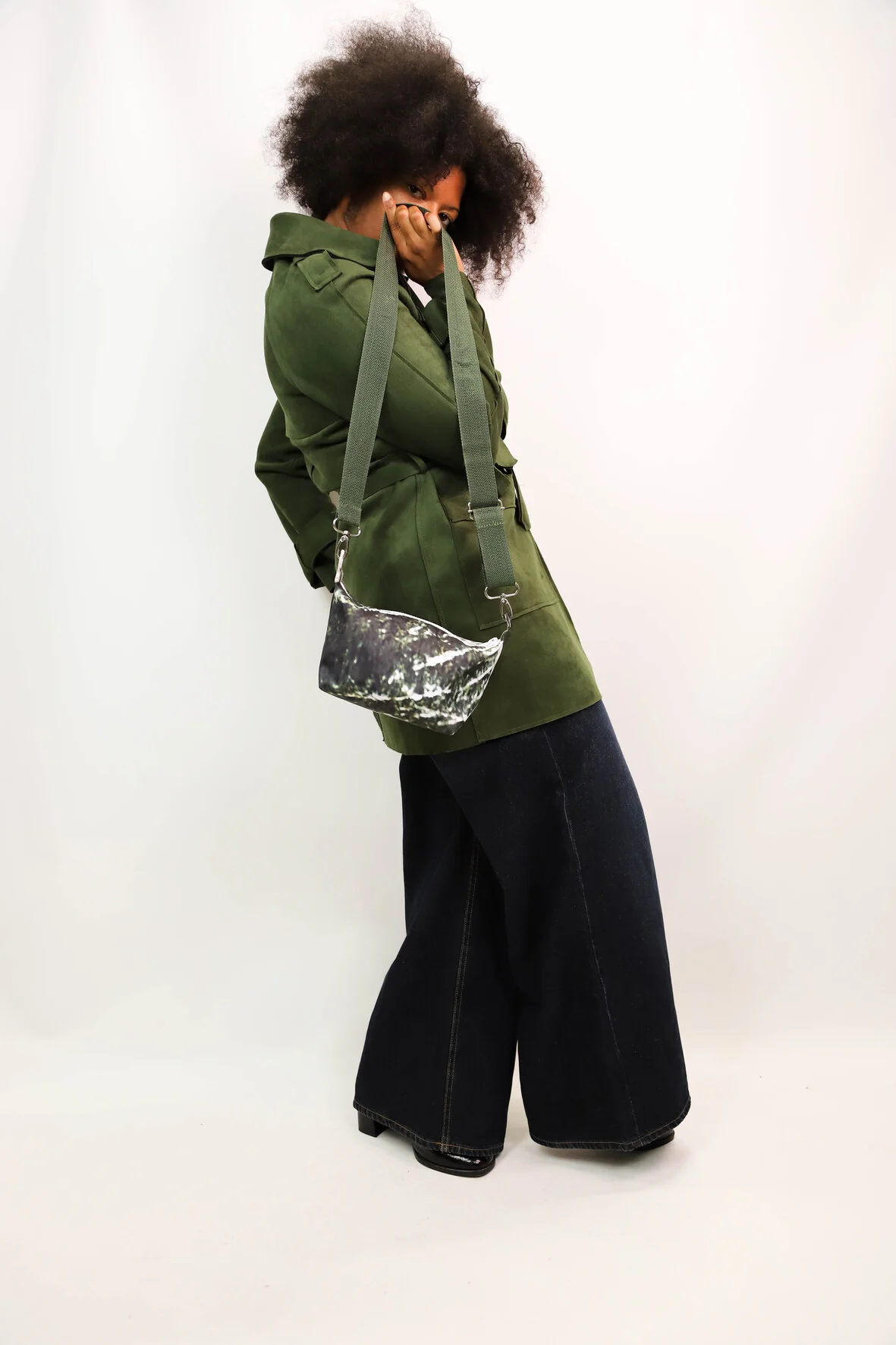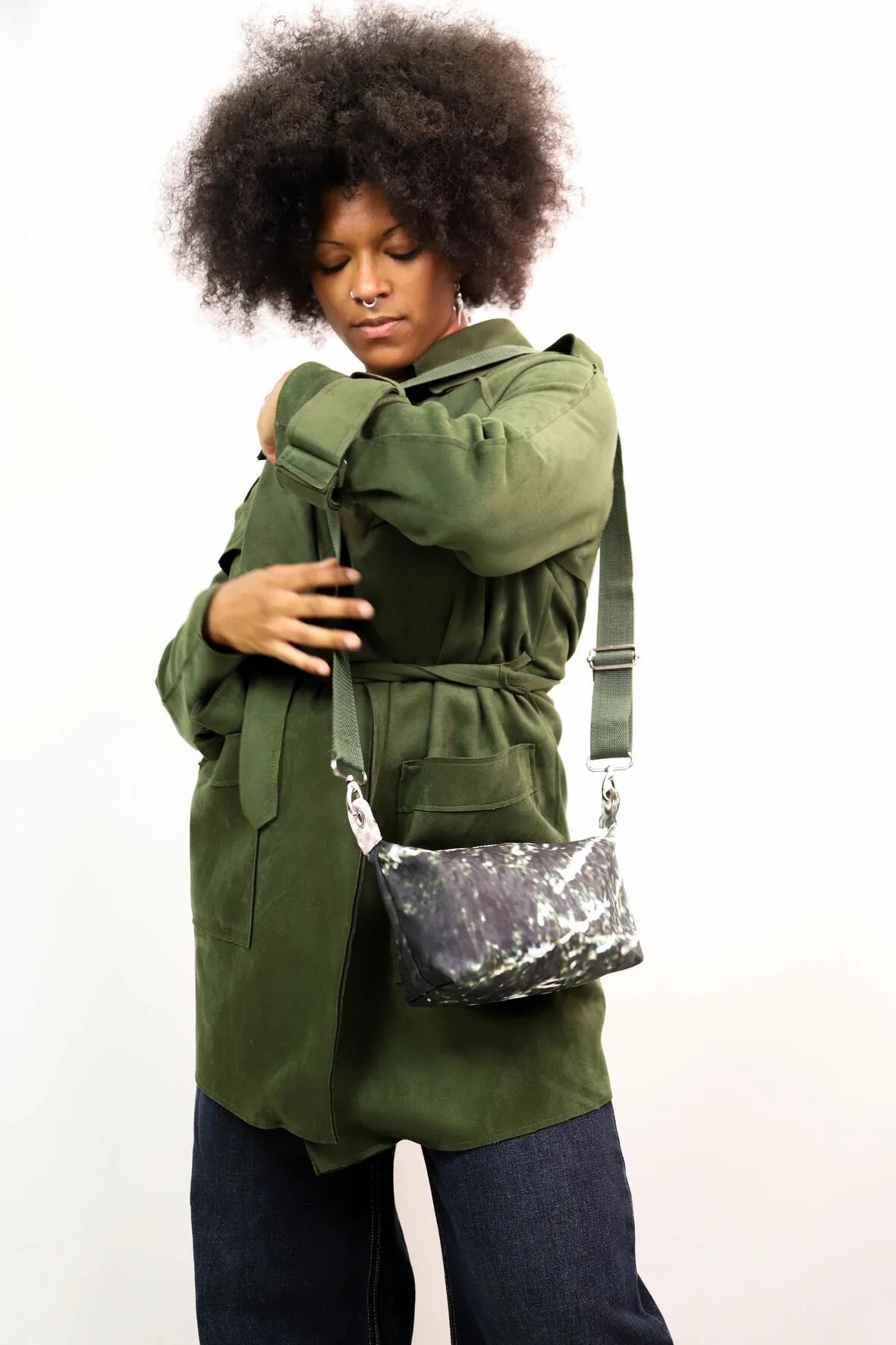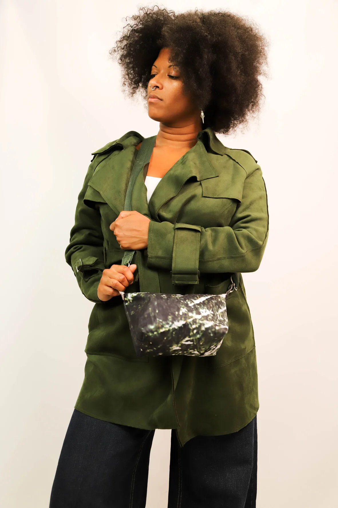 Sac pochette avec sangle de seconde main réglable verte. Fermeture éclaire blanche.