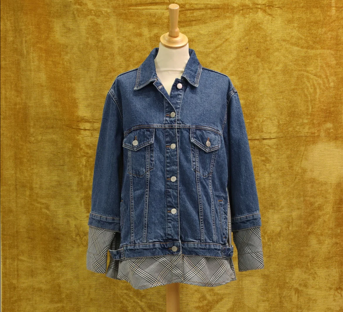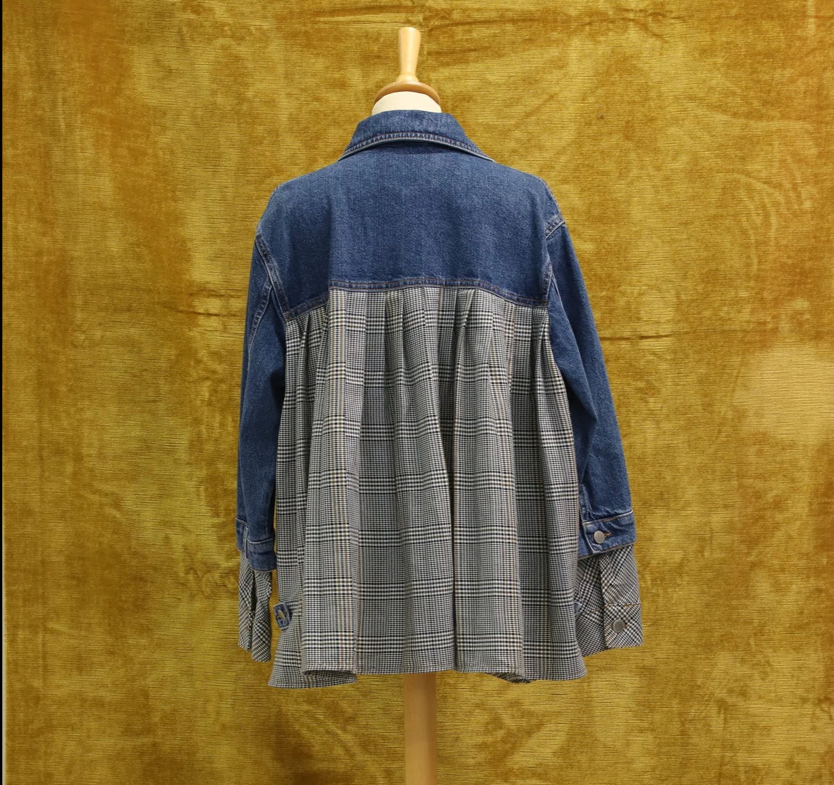 Veste en jean avec dos pied de poule plissée dans le dos, taille grand