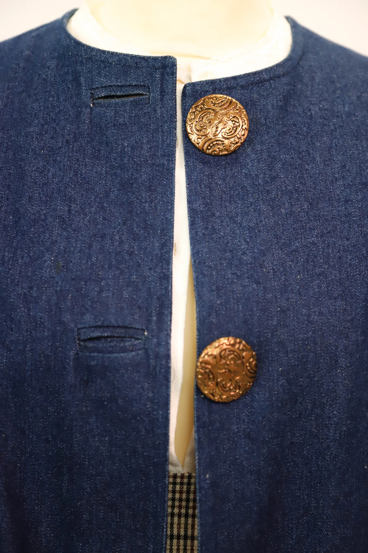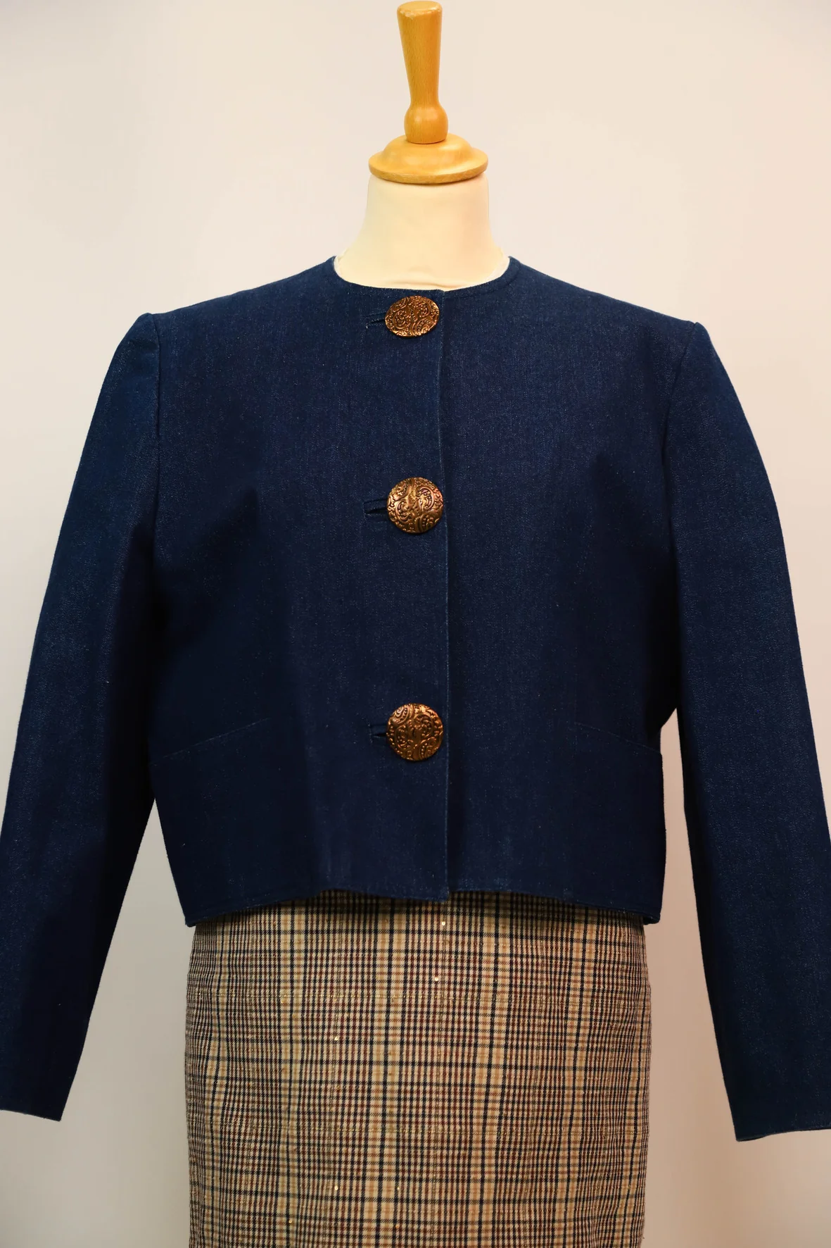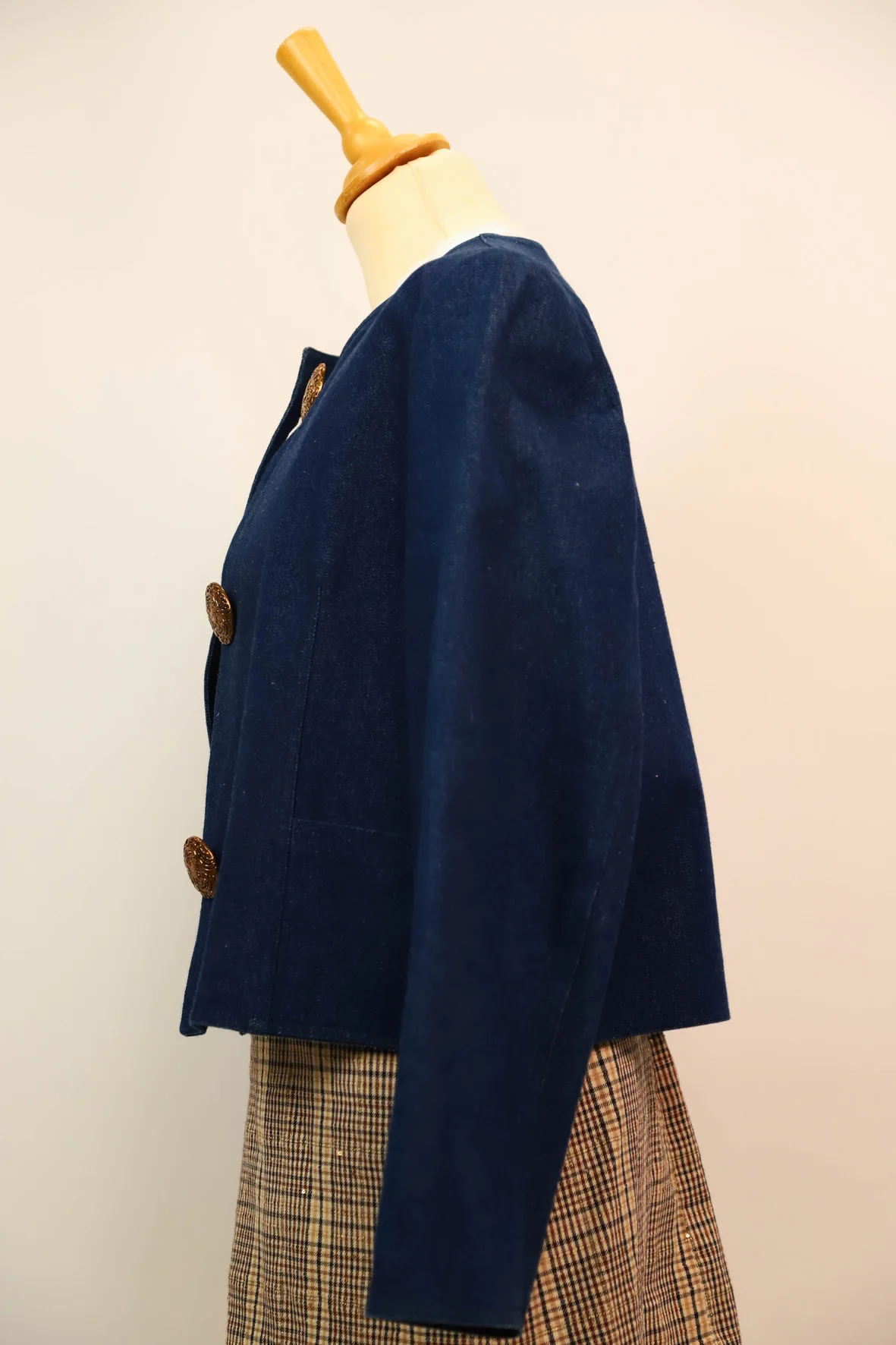 Veste en jean droite avec col rond. Boutons avec motifs en relief, couleur bronze