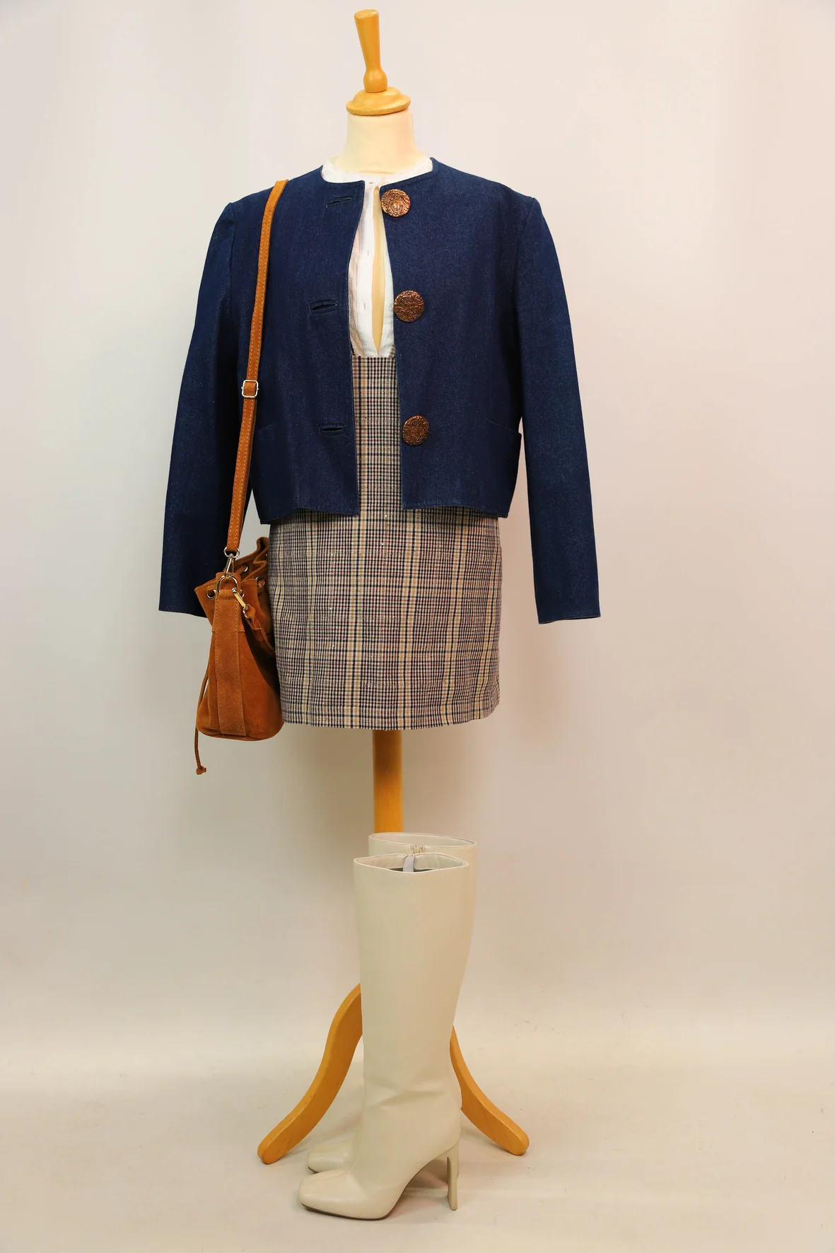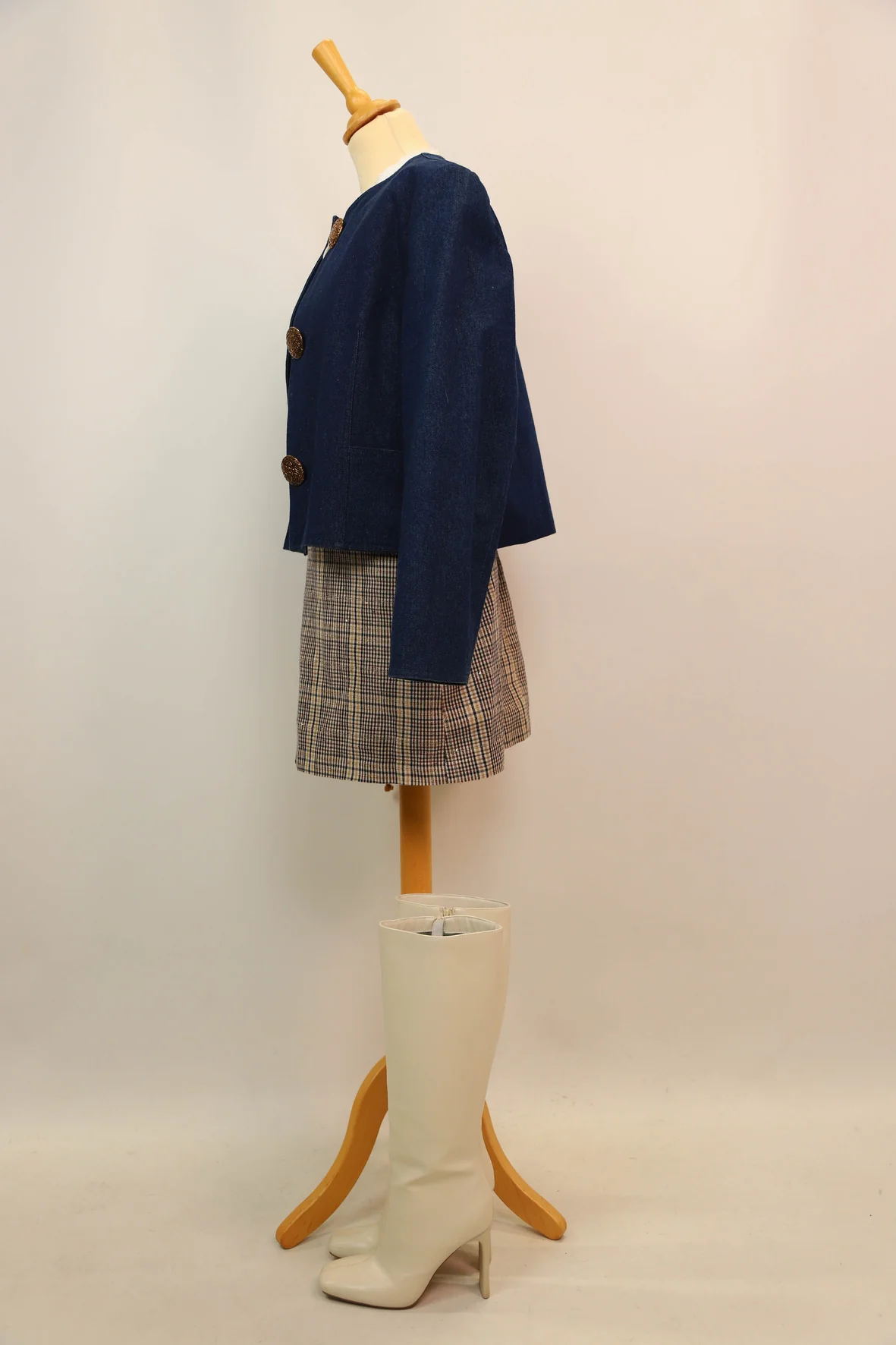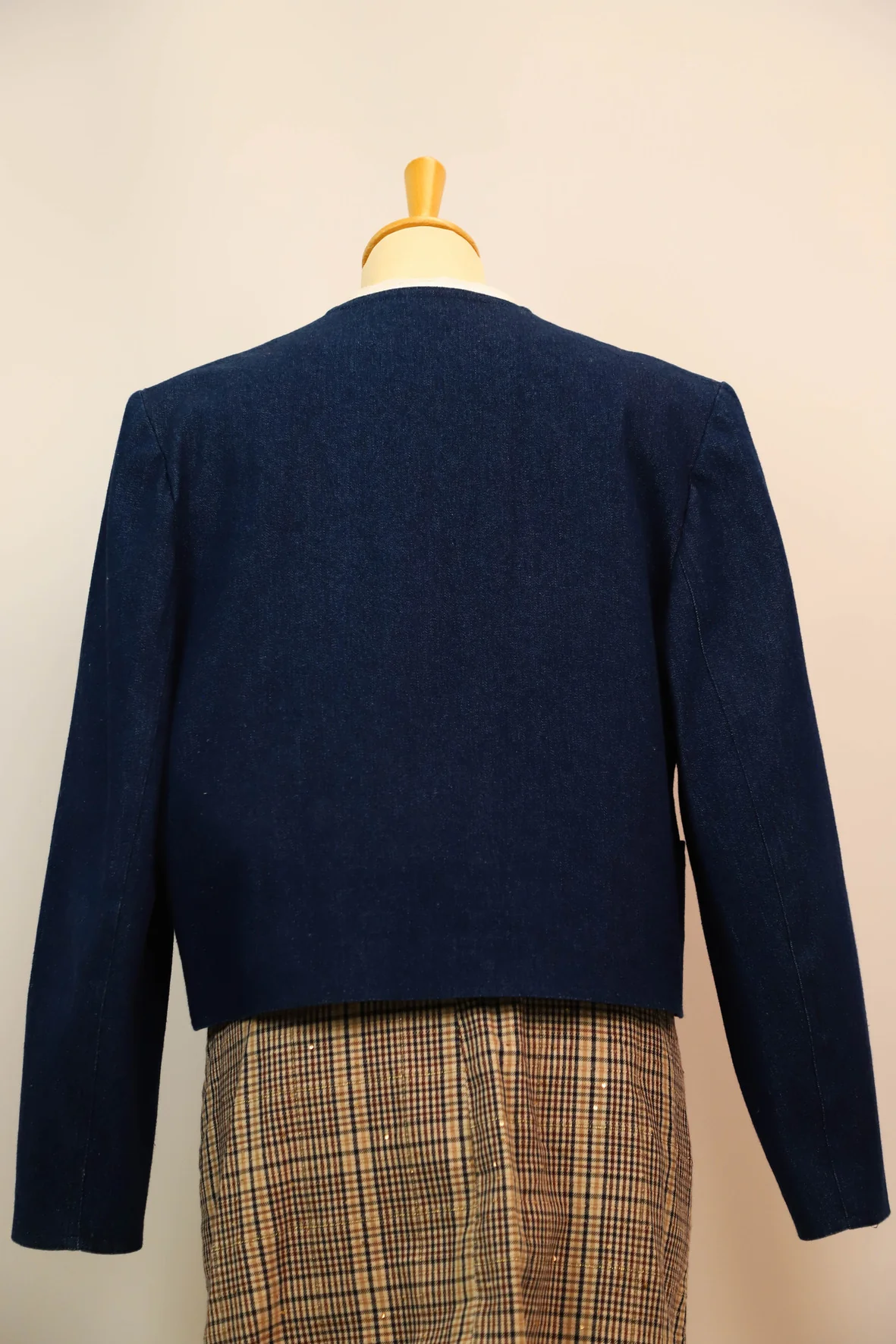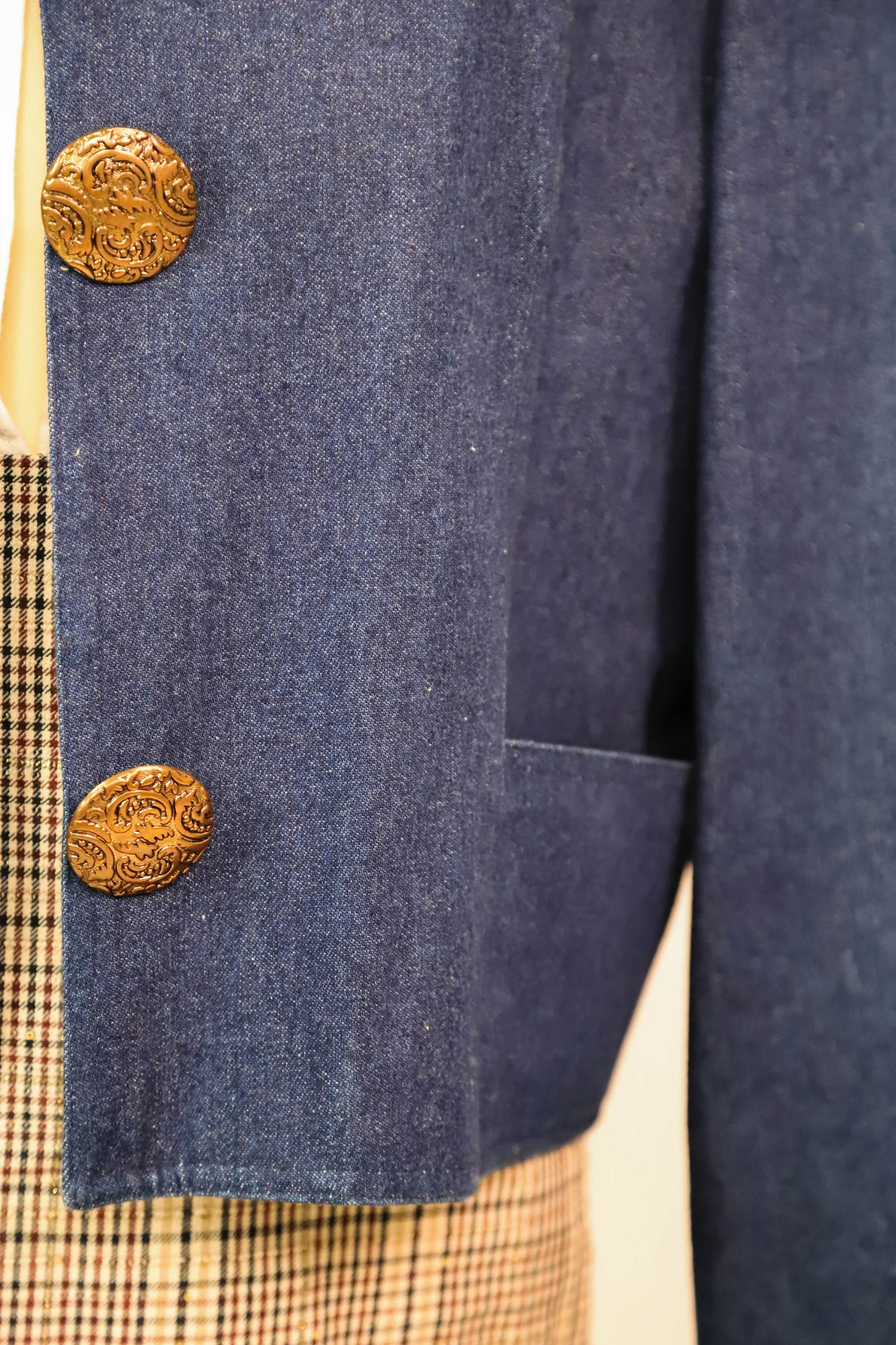 Veste en jean droite avec col rond. Boutons avec motifs en relief, couleur bronze