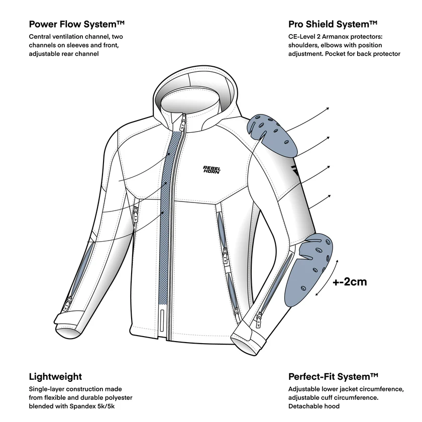 La veste de moto Rebelhorn Slash est conçue pour les passionnés de conduite urbaine. Elle présente une construction monocouche en polyester flexible et durable mélangé à du spandex 5k/5k, offrant une excellente respirabilité et étanchéité. La veste Slash est équipée de protecteurs de haute qualité Armanox® Niveau 2 aux coudes et aux épaules. Elle possède six canaux de ventilation qui fonctionnent en tandem avec une doublure respirante. La Rebelhorn Slash combine fonctionnalité et sécurité, ce qui en fait une veste urbaine idéale pour tous les jours.