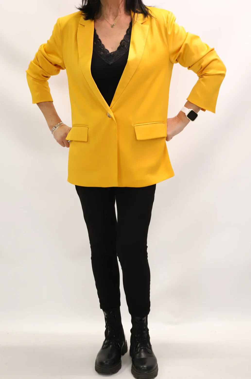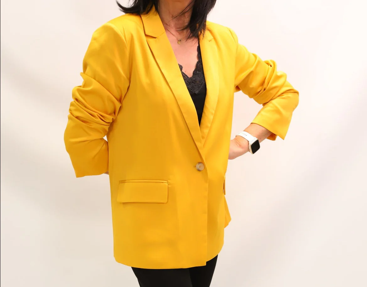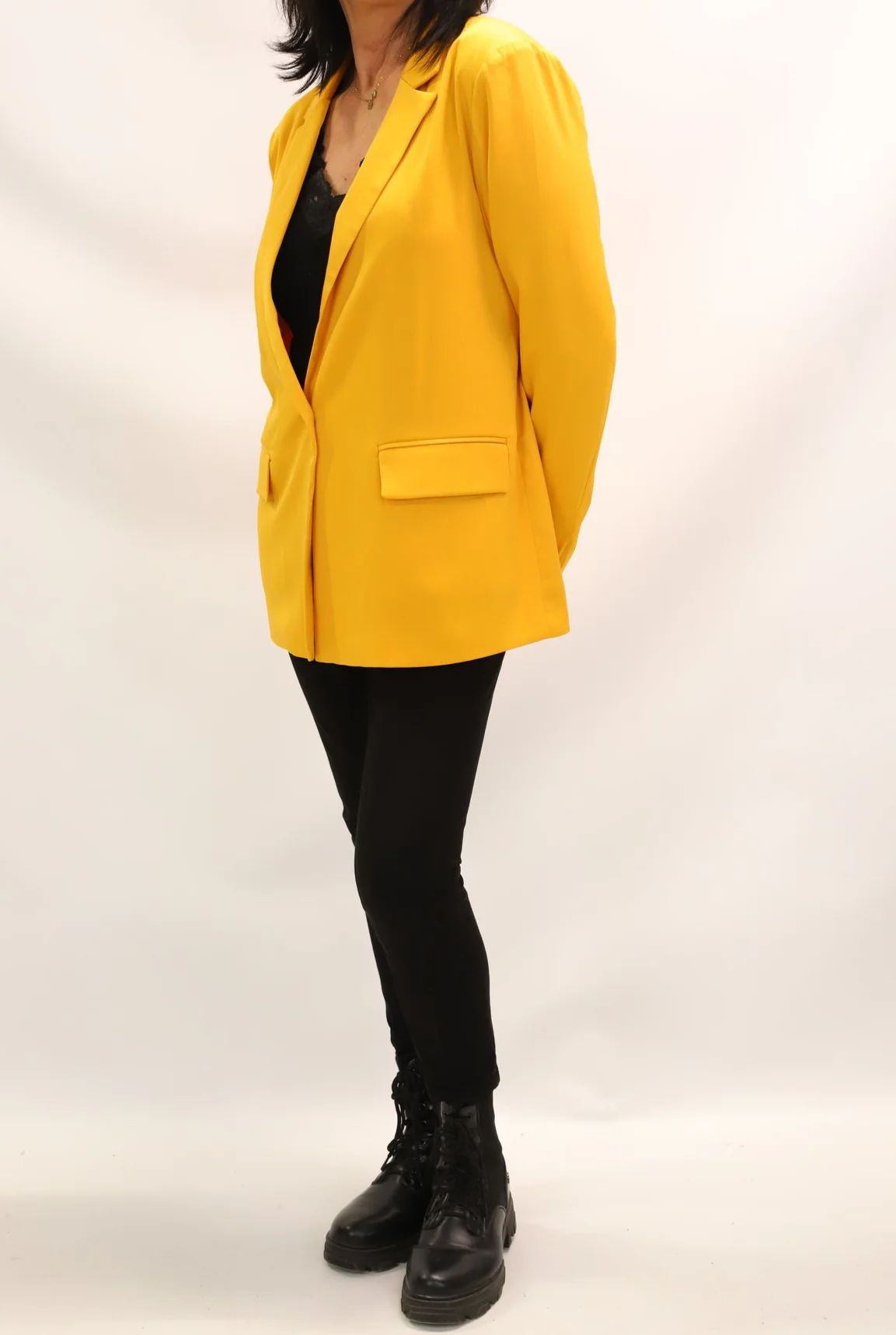 – Veste blazer long moutarde, boutonné par un bouton, deux poches à l’avant